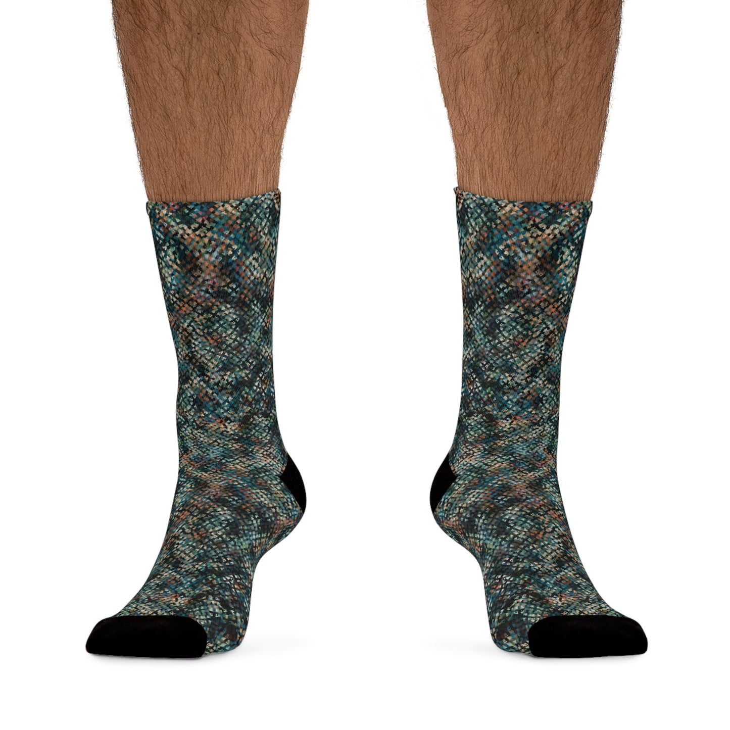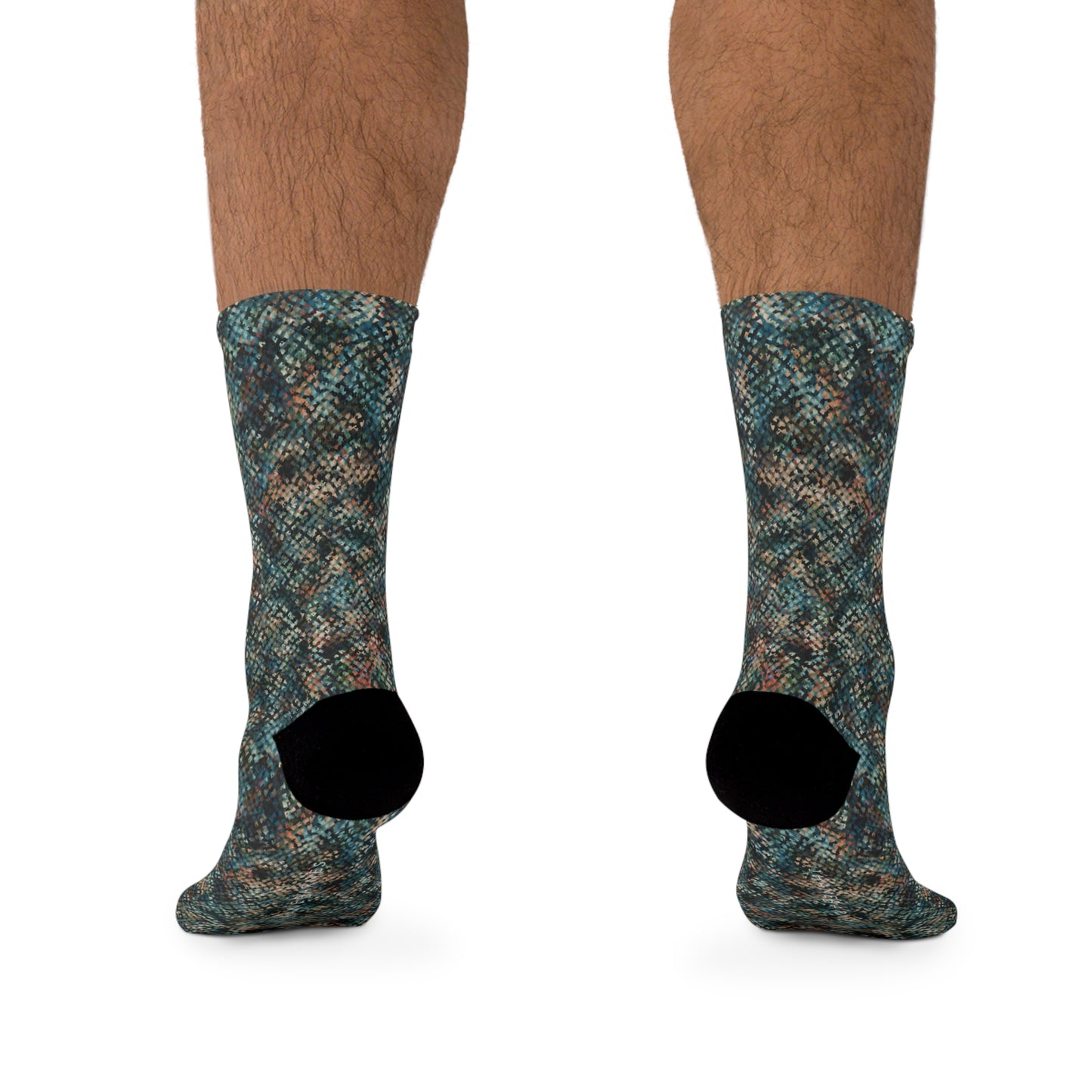 These unisex socks are made using a proprietary blend of yarns specially sourced. They are 200 needle knit crew made from 58% Recycled Polyester 22% Nylon 15% Cotton and 5% Elastane. They are a true one size fits most, and are available up to size 12 Men's (U.S.). These socks have an unprecedented amount of stretch with durable print quality.