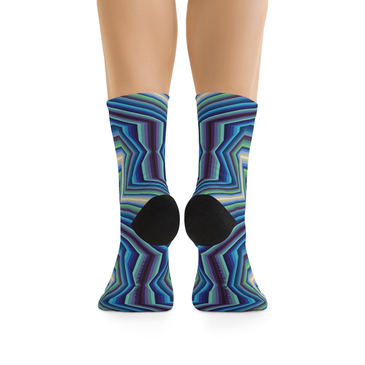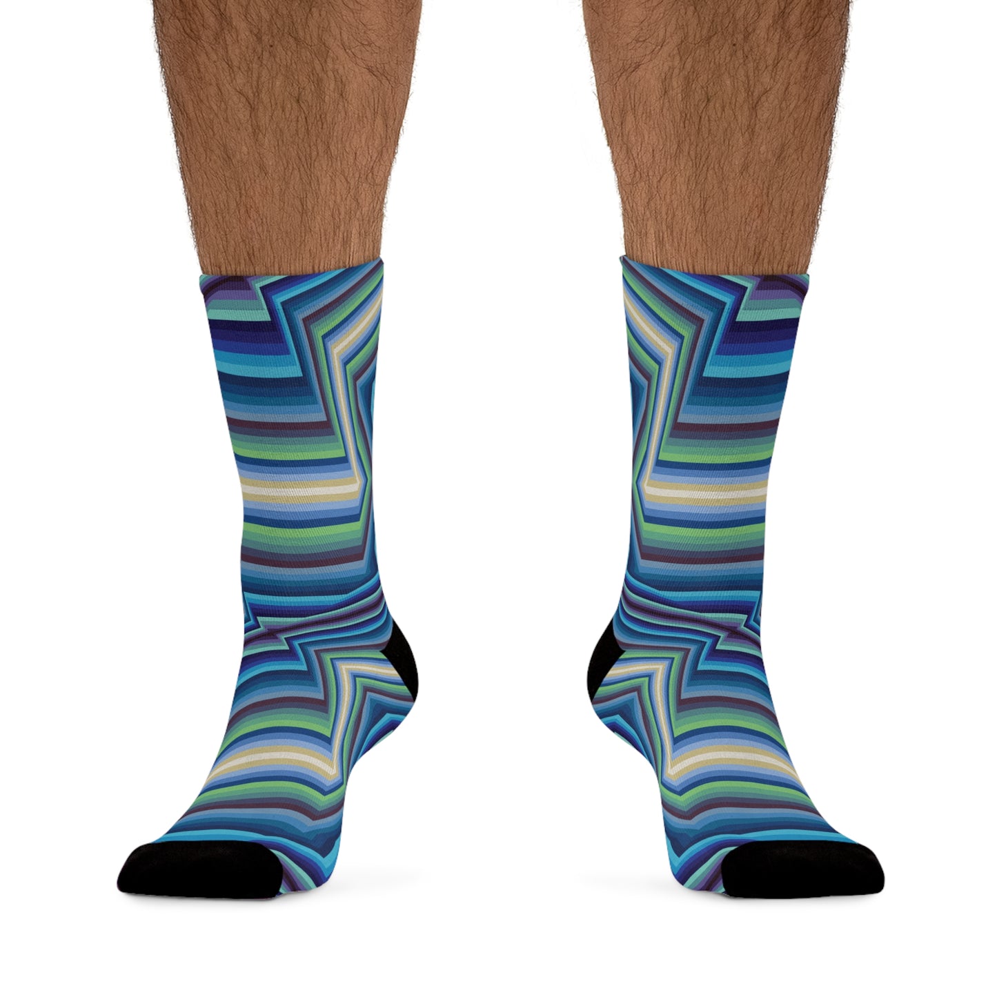 These unisex socks are made using a proprietary blend of yarns specially sourced. They are 200 needle knit crew made from 58% Recycled Polyester 22% Nylon 15% Cotton and 5% Elastane. They are a true one size fits most, and are available up to size 12 Men's (U.S.). These socks have an unprecedented amount of stretch with durable print quality.